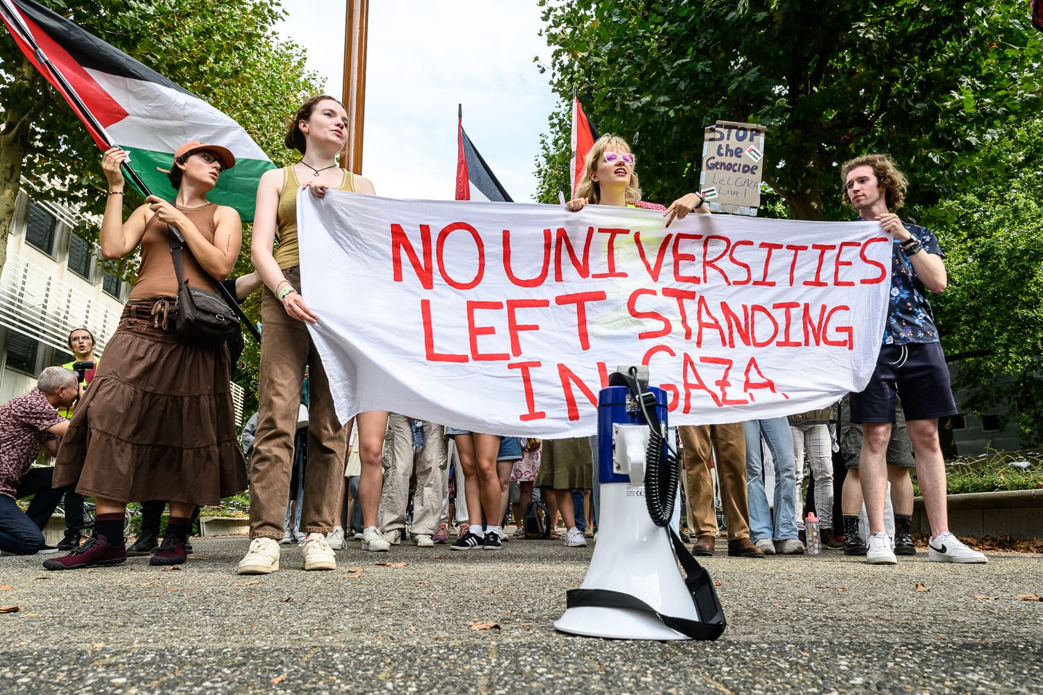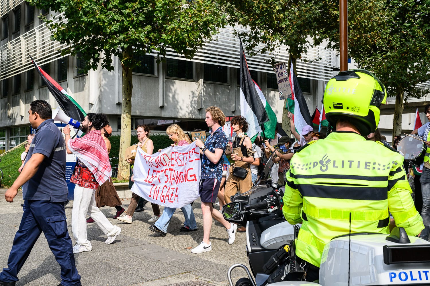 Enkele foto’s van de protestactie door Palestine Solidarity Tilburg tijdens de opening van het Academisch jaar van Tilburg University. Het verslag hiervan is te lezen op de website van UniversOnline: Palestine Solidarity Tilburg protesteert tijdens opening academisch jaar.
